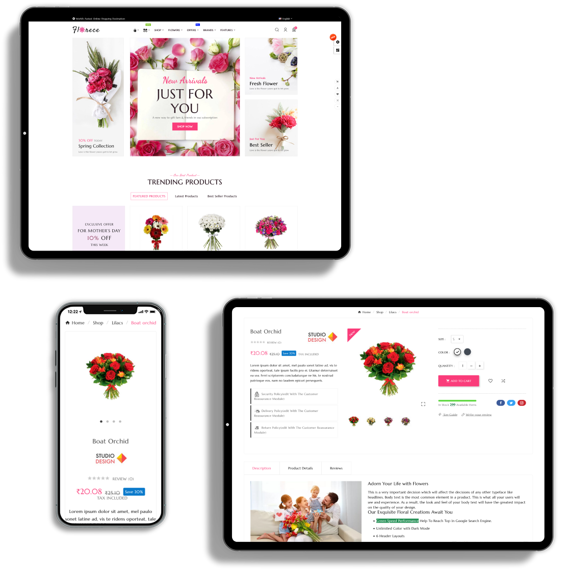 FLORECE is fully responsive, adapt the device size, pixel perfect and all elements look beautiful in all standard and Retina devices and resolutions.