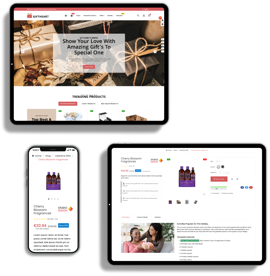 Giftheart is fully responsive, adapt the device size, pixel perfect and all elements look beautiful in all standard and Retina devices and resolutions.