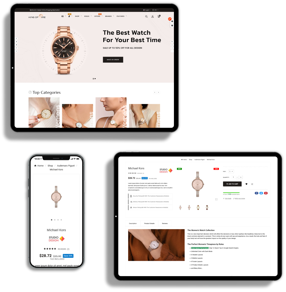 KINGOFTIME is fully responsive, adapt the device size, pixel perfect and all elements look beautiful in all standard and Retina devices and resolutions.