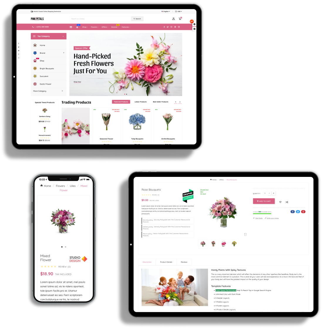 PINKPETALS is fully responsive, adapt the device size, pixel perfect and all elements look beautiful in all standard and Retina devices and resolutions.